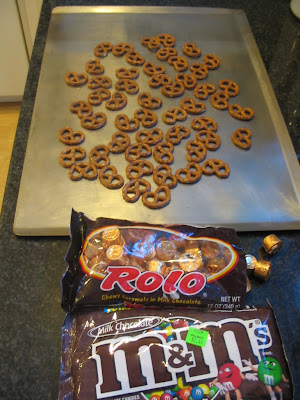 All you need are pretzels, Rolo candy, and topping of your choice....today I used m&ms......in the fall I'll use candy corn....at Christmas time I'll use pecans.