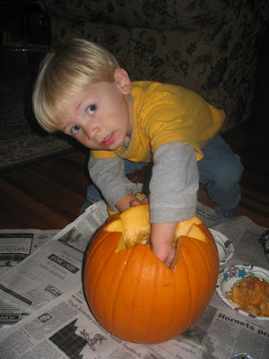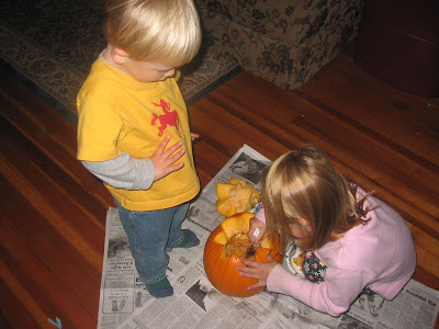 They were sooooo excited to carve the pumpkin this year......so how come I found myself carving it all by myself after 5 minutes? That's how long it took them to figure out "its really gooey in there mom." Caroline wanted to eat the pumpkin seeds, but she didn't want to get them out....