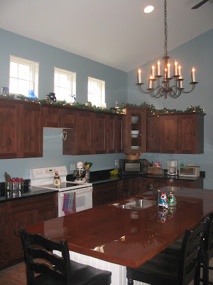 And Rob's stepfather has been working on this..... a wood counter top for our island.....here it is unfinished, with the undermount sink in place. And you wouldn't know it but there are steel rods running through it for support.