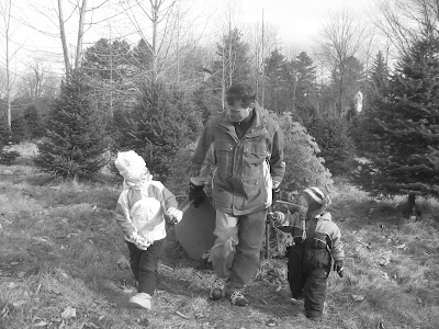 It was a touch and go search....a little whining, a bit of crying, Cooper wanting to be held, Caroline had a boot malfunction......but in the end we found our tree! Cooper liked the sawing part!