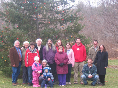 After stuffing ourselves at Nana and Grampa's house on Thanksgiving, I traveled up to Vermont with the kids to see Gramma and Shener......Rob stayed home to work on projects (without 2 little kids bugging him) and came up on Sunday to eat turkey dinner #2....after eating turkey leftovers for 2 days from turkey dinner #1......yes...we are blessed with lots of family....and lots of Thanksgivings. So, every year we have the tradition of putting lights on the pine tree in the back of my mom's house and taking a family picture......the tree was itty bitty when we started this tradition....now it takes ladders and throwing, I mean tossing...lights as high as we can.