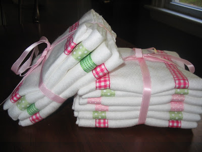 A peek at what I've been sewing.....baby gifts!!! The easiest sewing project ever is to sew ribbon on to cloth diapers...and poof....very pretty burp clothes. My neighbor made a set for me when I had Cooper and I love them! And my new project is making bibs....I also received a few great homemade bibs when I delivered Caroline and to this day they are the kids' favorite bibs to wear.
